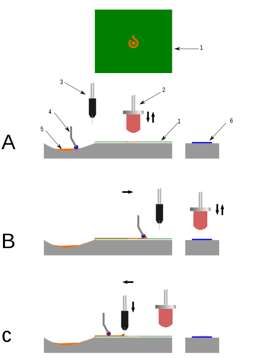- 從起始位置開(kāi)始,密封的墨杯(倒置的盛有墨水的杯子)位于印版蝕刻圖稿區(qū)域上方,覆蓋圖像并用墨水填充圖像。